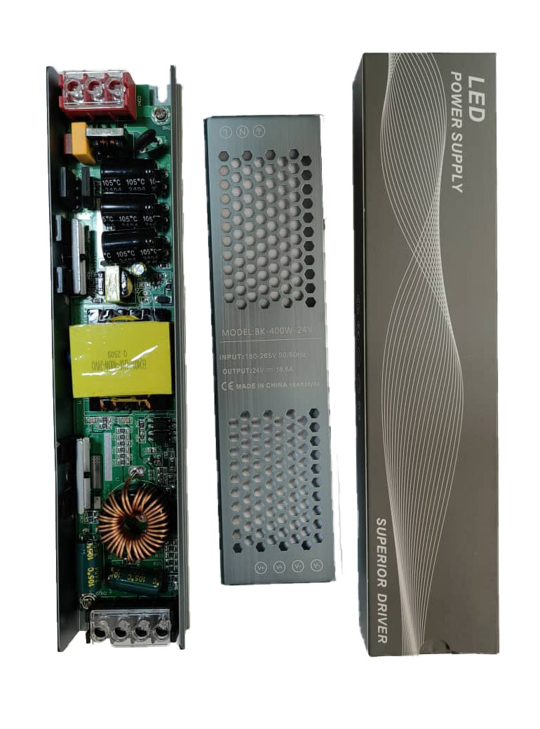 سوییچینگ 24 ولت 4۰۰ وات (16/5 آمپر) اسلیم یا باریک با ابعاد طول 238میلیمتر، عرض 48 میلیمتر و ارتفاع ۲۲ میلیمتر میباشد.