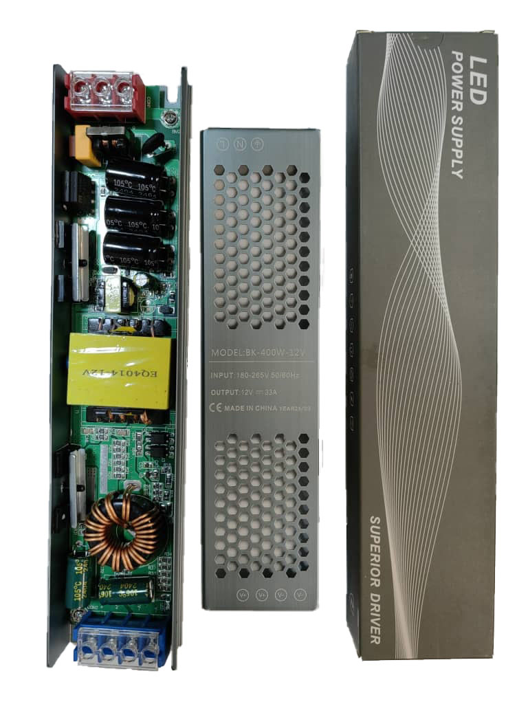 سوییچینگ ۱۲ ولت 400 وات (33 آمپر) اسلیم یا باریک با ابعاد طول 238میلیمتر، عرض 48 میلیمتر و ارتفاع ۲۲ میلیمتر میباشد.